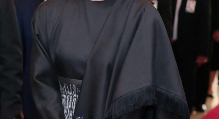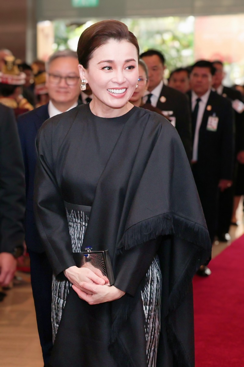 ทรงฉลองพระองค์ตัดเย็บจากผ้าไหมมัดหมี่ลายก้างปลา ผสมผสานกับผ้าไหมลายลูกแก้ว ออกแบบโดยห้องเสื้อ MESHMUSEUM ตัดเย็บจากผ้าไหมมัดหมี่สีดำสลับเทาผ้าซิ่นถูกทำลายขึ้นมาแบบลายก้างปลา ผสมผสานกับ ผ้าไหมทอลายลูกแก้ว ทรงฉลองพระองค์ชุดนี้โดดเด่นด้วยงานออกแบบที่แสดงเอกลักษณ์ไทยได้อย่างงดงามเลยจริงๆ เป็นการสืบสาน ผ้ามัดหมี่ ที่พระพันปีทรงอนุรักษ์ไว้ สืบสานและฟื้นฟูงานผ้าทอและหัตถศิลป์ของไทย